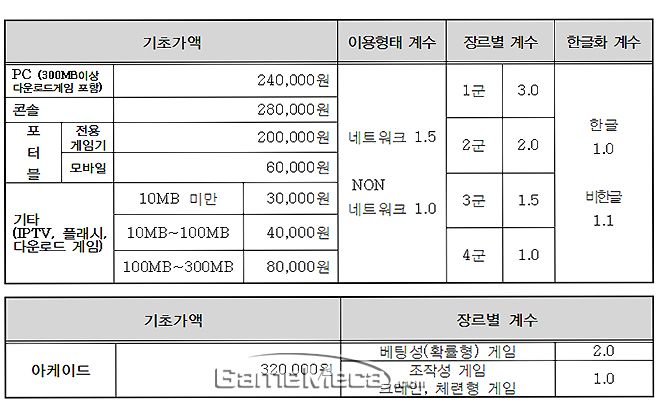 위 계산을 통해 따져봤을 때 온라인 MMORPG와 고포류 게임, 그리고 아케이드 배팅성 게임에 대한 수수료가 큰 폭으로 인상된 것으로 나타났다. MMORPG는 108만원에서 216만원으로 정확히 2배 늘었으며, 온라인 고포류 게임은 72만원에서 216만원으로 3배 상승했다. 또한 아케이드 배팅성 게임의 수수료는 64만원에서 135만원으로 110.9% 증가했다.