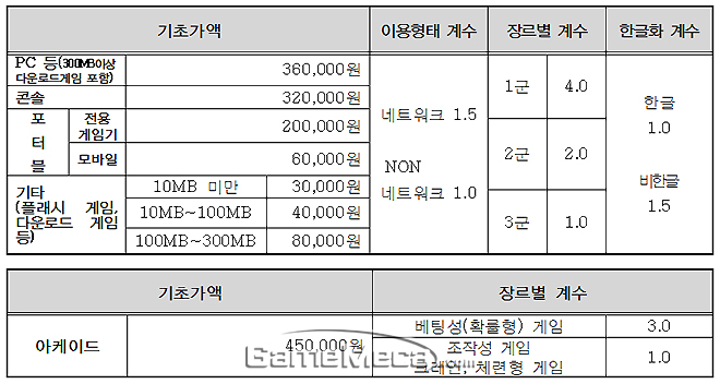 각 게임물에 대한 등급 수수료는 PC/온라인, 콘솔, 포터블, 모바일, 아케이드 등 각 플랫폼에 대한 기초가액에 네트워크, 장르, 한글화 여부 등에 부여된 별도의 계수를 곱해서 산출된다. 예를 들어 한글이 지원되는 온라인 MMORPG의 경우 기초가액 36만원에 네트워크 계수 1.5와 RPG가 속한 1군에 해당하는 4.0을 곱하면 총 216만원이라는 가격이 나온다.