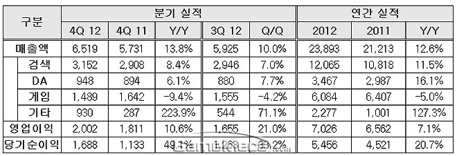 NHN은 2012년 연간 매출 2조 3,893억 원, 영업이익 7,026억 원, 당기순이익 5,456억 원의 실적을 달성했다고 밝혔다. 이는 전년 대비 매출은 12.6%, 영업이익은 7.1%, 순이익은 20.7% 상승한 수치다.