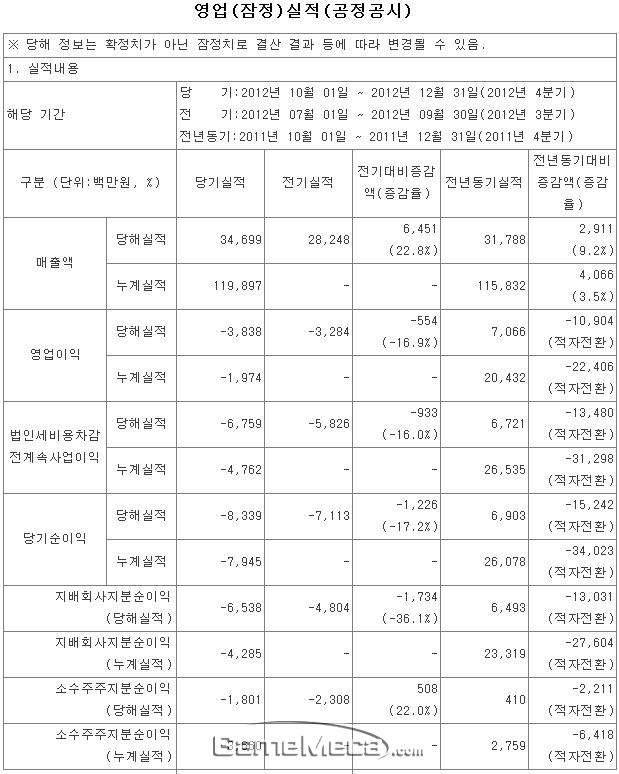 한편 4분기 모바일게임 사업 전개를 위한 적극적인 투자로 인건비 상승과 ‘지스타2012’ 공식후원 및 참가에 따른 비용집행으로 영업비용이 22% 증가했다.
