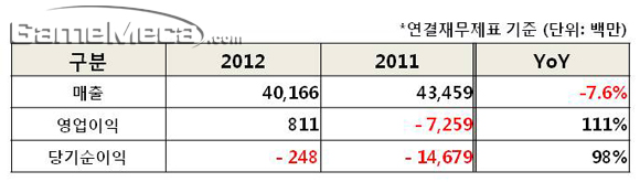 한빛소프트는 2012년 연결기준 실적으로 매출 401억원, 영업이익 8억원, 당기순손실 2억원을 달성했다고 8일 공시했다. 이 같은 실적은 전년대비 매출 33억원 감소, 영업이익은 전년 영업손실 729억에서 흑자 전환했고, 당기순손실은 전년 순손실 147억원에서 큰 폭으로 줄인 수치다.