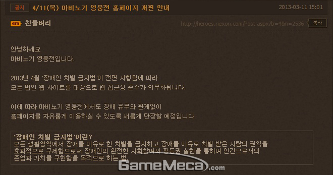 ▲ 장애인차별금지법에 전면 시행에 따른 홈페이지 개편을 알린 '마비노기 영웅전'