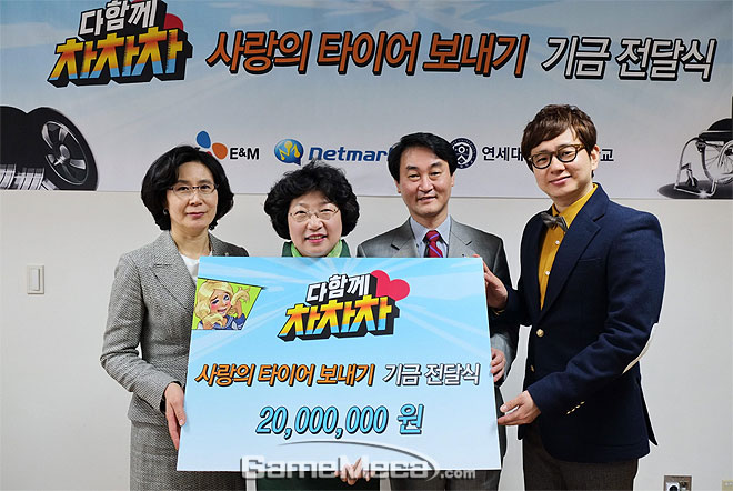 CJ E&M 넷마블은 국민 자동차 레이싱 액션게임 '다함께 차차차 for Kakao'에서 진행한 ‘다함께 차차차 사랑의 타이어 캠페인’ 기부금을 전달했다.