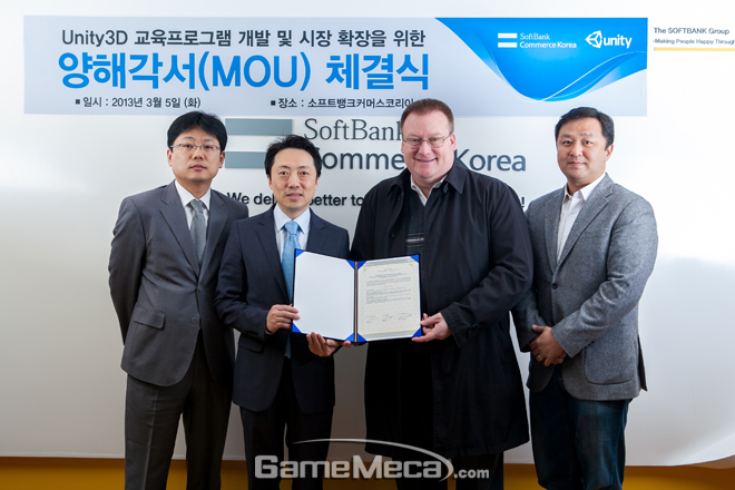 유니티 테크놀로지스 코리아와 글로벌 IT 유통&기술 마케팅 전문기업인 소프트뱅크커머스는 유니티 3D 교육 프로그램 개발과 시장 확장 위한 양해각서(MOU)를 체결했다고 밝혔다.