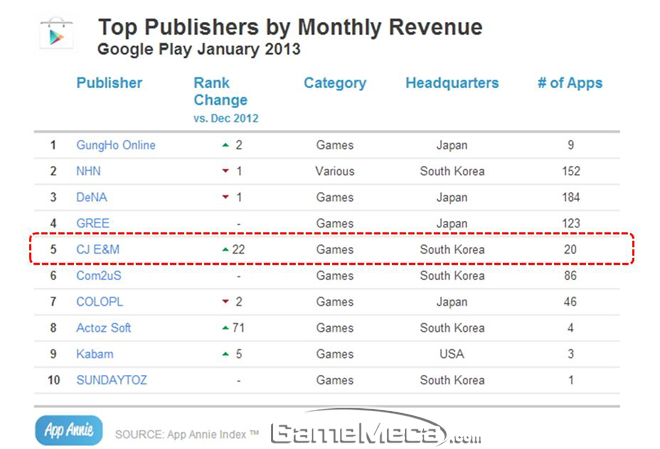 CJ E&M은 앱마켓 분석사이트 ‘앱애니(app annie)’가 조사한 글로벌 구글플레이 월간매출 순위(2013년 1월)에서 전월 대비 22계단 상승한 5위를 차지했다.