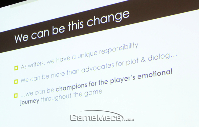 수잔 오코너, 그리고 척 비버는 "작가는 플레이어의 감정 여행을 책임지는 챔피언"이라 비유하며, 결국 "게임의 생명력을 길게 이어 나가는 것은 뛰어난 현대 기술도, 그래픽도 총도 아니다"며, "감정을 전달하는 것이 바로 게임의 비밀 무기다"라고 강조했다.