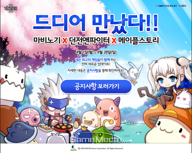 티저 페이지를 통해 공개된 이 업데이트는 ‘마비노기X던전앤파이터X메이플스토리’라는 이름으로 지금까지 듣지도 보지도 못했던 전혀 새로운 업데이트라고 소개했다. 업데이트 내용은 비공개지만 티저 페이지로 본 이번 업데이트 내용은 각 게임의 대표 캐릭터가 등장하여 ‘오코노미야끼’ 요리 대결을 펼칠 것으로 유추된다. 자세한 내용은 공지사항을 통해 확인 가능하다.