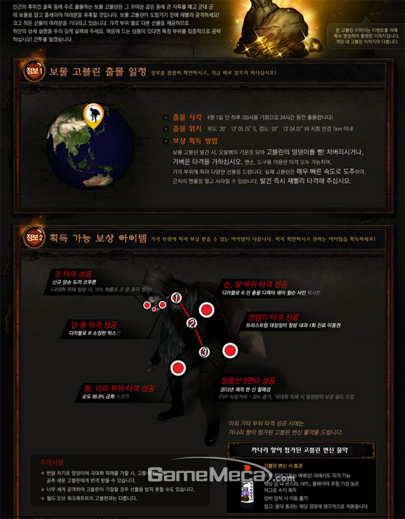 고블린은 보물 자루를 메고 후미진 골목을 전전하는데, 게이머는 고블린이 도망가기 전 공격하여 보상을 획득할 수 있다. 특히, 가격하는 부위에 따라 다양한 보상이 주어진다. 예를 들어 고블린의 코를 때리면 신규 양손 도끼 ‘코푸른’을 얻을 수 있고, 목과 가슴 그리고 중요 부위까지 3연타를 성공하면 2013년 제작 판 신 ‘할매검’을 획득할 수 있다.