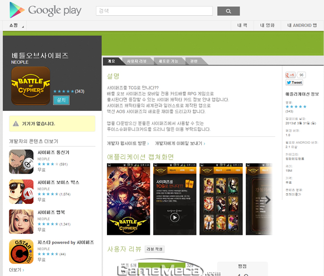 넥슨의 AOS ‘사이퍼즈’가 모바일 전용 카드배틀 RPG ‘배틀 오브 사이퍼즈’를 공개했다. 이 게임은 AOS와 TCG가 결합된 장르로 ‘사이퍼즈’의 세계관과 캐릭터 일러스트를 기반으로 한다. 앱을 다운받으면 ‘사이퍼즈’에서 사용할 수 있는 루이스 슈퍼유니크카드를 증정한다. ‘배틀 오브 사이퍼즈’는 구글 플레이에 우선 공개됐다.