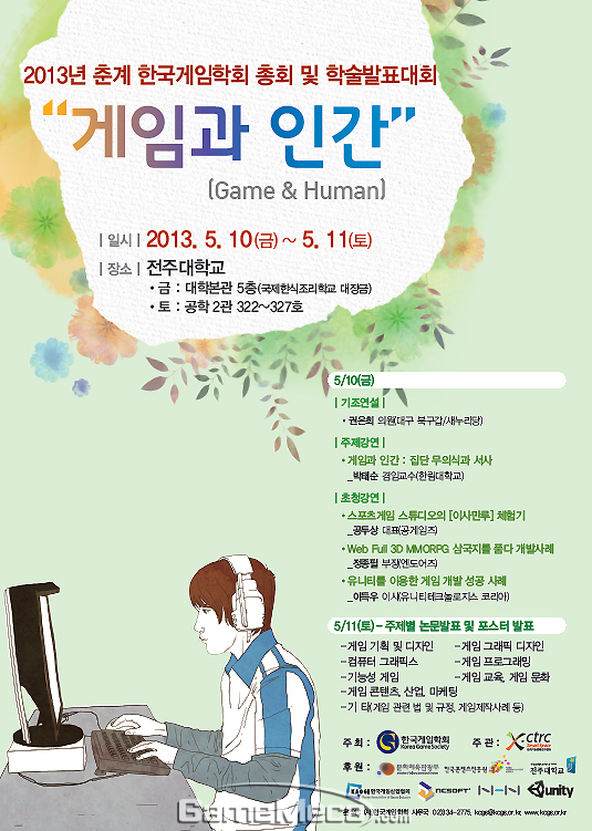 한국게임학회는 5월 10일과 11일, 이틀 간 전주대학교에서 '게임과 인간'을 주제로 한 춘계 학술발표대회를 개최한다.