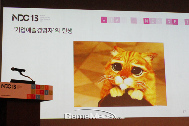 이어 전 교수는 디즈니, 픽사 등의 사례를 소개해 기업이 예술을 통해 사업을 경영하는 ‘예술경영’에 대해 언급했고, 넥슨 외에도 전 세계의 다양한 회사들이 이런 행보를 보이고 있음을 시사했다. 그는 강연 이후 이어진 인터뷰에서도 “큰 규모의 회사뿐만 아니라, 막 사업을 시작하는 작은 회사들도 예술경영을 핵심동력으로 본다”며 “아이패드로 악기 연주를 하며 밴드를 구성하는 회사들도 있다. 굳이 자본과 규모의 문제가 아니라 경영자의 예술에 대한 관심과 철학이 중요”라고 말했다.