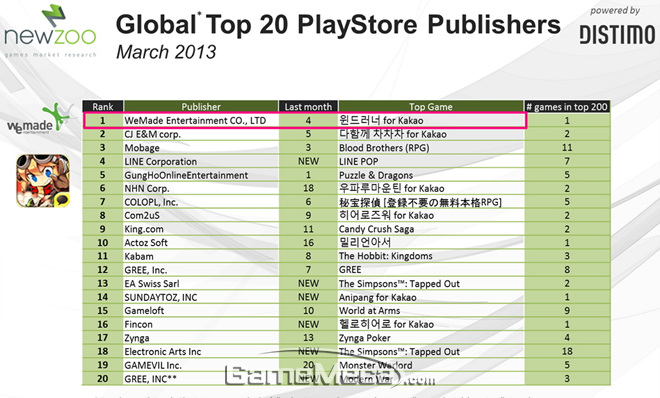 게임관련 국제 시장조사기업 뉴주가 발표한 3월 전 세계 ‘탑 20 모바일 퍼블리셔: 플레이스토어’ 순위에서 국내 게임사 위메이드가 1위를 차지했다. 특히, 북미, 일본 등의 대형 게임 업체들을 제친 것에 의미가 있다.