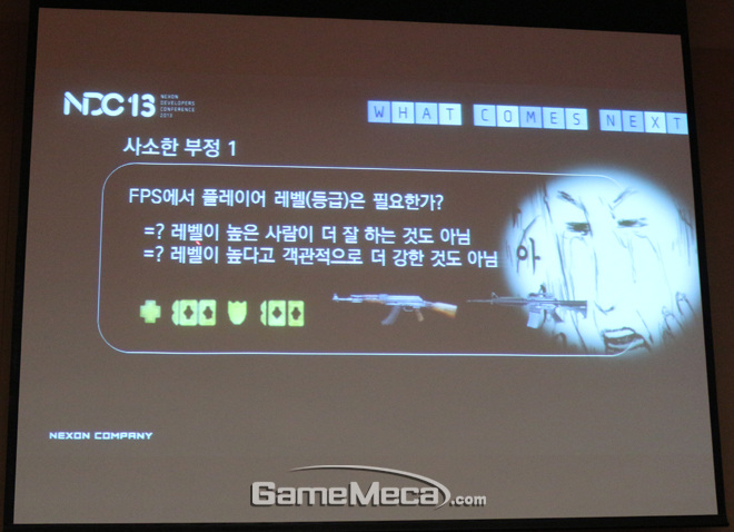 두 사람이 강조한 FPS의 특징은 ▲반복 경험을 통한 숙련 ▲평등한 환경과 무기 ▲극대화된 경쟁 총 3가지로, RPG와는 다른 시스템을 도입해야 함을 밝혔다.