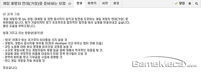 현재 게임개발자연대의 공식 페이스북에는 총 185명이 가입한 상태다. 연대 출범에 앞장선 김종득 개발자는 “트위터와 페이스북을 통해 개발자 협회 관련 이야기를 하다가, 게임 개발자 연대 준비 위원회를 만들었다. 지속적인 관심과 도움을 주길 바란다”라고 밝혔다.