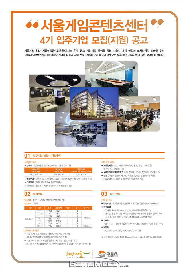 서울시와 서울시 일자리 창출의 주역 기관인 SBA(서울산업통상진흥원)는 서울 소재 중소게임사의 성장을 지원하고자 ‘서울게임콘텐츠센터 4기 입주기업’을 6월 5일(수)까지 모집한다고 밝혔다.