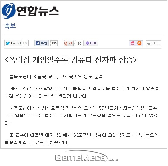 ▲ 폭력적인 게임일수록 전자파 방출량이 증가한다는 연구결과를 게재한 연합뉴스 기사