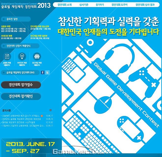 문화체육관광부와 한국콘텐츠진흥원이 창의적, 독창적 게임콘텐츠 발굴을 통한 게임산업의 글로벌 경쟁력 강화와 게임개발 기회 확대를 통한 전문인력 양성을 목적으로 개최하는 2013 글로벌 게임제작 경진대회 상용화 부문 예선 접수가 17일 시작됐다.