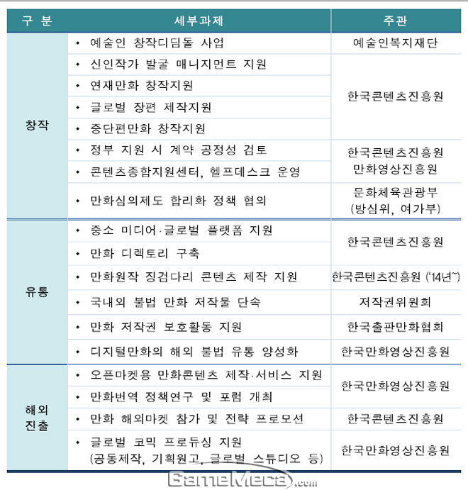 ▲ 만화 창작 생태계 활성화 대책 향목별 세부 과제 (자료제공: 문화부)