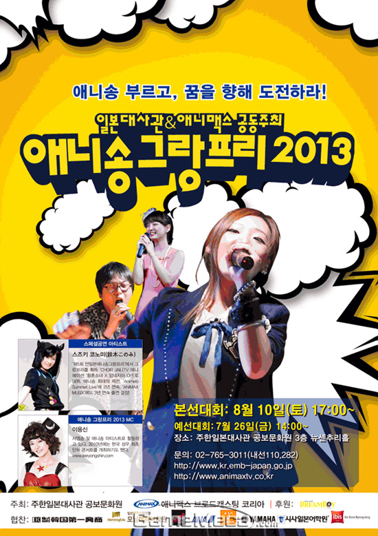 주한일본대사관 공보문화원과 글로벌 애니메이션채널 애니맥스코리아가 공동주최하는 '애니송 그랑프리 2013' 본선대회가 오는 8월 10일 당관 공보문화원에서 개최된다.