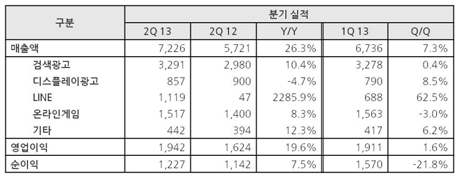 NHN은 2013년 2분기 실적(연결기준)으로 매출 7,226억 원, 영업이익 1,942억 원, 당기순이익 1,227억 원을 달성했다고 밝혔다. 이는 전년동기 대비 매출액 26.3%, 영업이익 19.6%, 당기순이익 7.5% 상승한 수치다.
