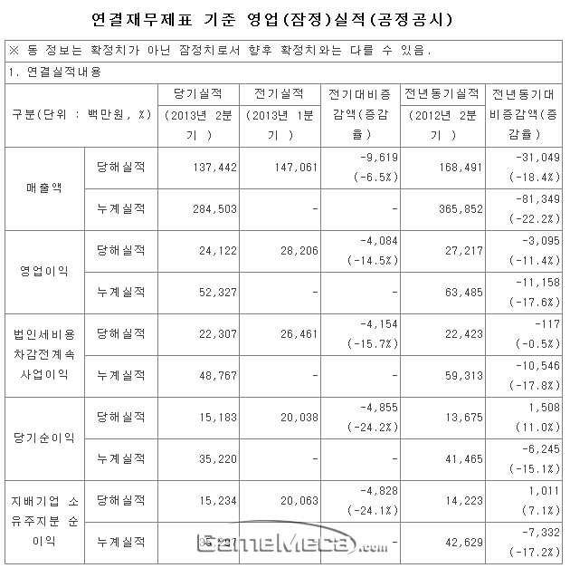 네오위즈게임즈는 14일, 자사의 2013년 2분기(4~6월) 영업실적을 공시했다.