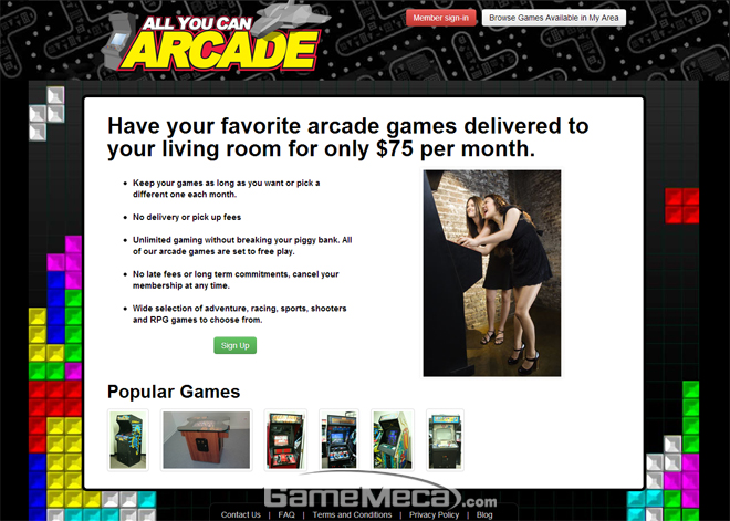 ‘All you can Arcade’라는 이름의 이 서비스는 미국의 세스와 티모시 피터슨 형제가 운영하는 아케이드게임기 홈 대여 서비스다. 공식 사이트 회원에 가입하거나 이베이나 크레이그레스트(광고 웹사이트)를 통해 대여 신청을 할 수 있으며, 한 달에 1대 당 75달러(한화 8만 3천 원)만 내면 된다.