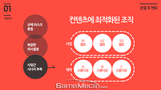 내부 요인으로는 NHN의 게임산업 한계를 지목했다. 포탈과 게임에 대한 규제 중첩, 조직이 비대해지면서 복잡한 의사 결정 발생, 한게임과 네이버가 트래픽을 주고받으며 굉장한 시너지를 냈지만 최근 시너지 효과가 감소하는 추세로 새로운 환경이 필요했다고 전했다.