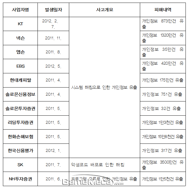 업체 별로는 SK컴즈 3500만건, 넥슨 1320만건, KT 873만건, EBS 420만건, 엡손 35만건으로 나타났으며, 금융권에서는 현대캐피탈 175만건, 한화손해보험 15만8천건, NH투자증권 1만5천건, 리딩투자증권 1만3천건, 솔로몬신용정보 751건, 한국신용평가 317건, 솔로몬투자증권 32건 등으로 집계됐다.