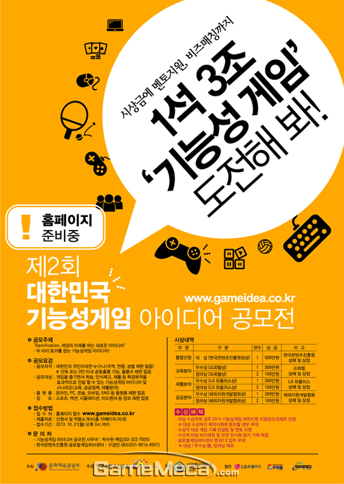 문화체육관광부와 한국콘텐츠진흥원은 산업통상자원부, LG유플러스, 프뢰벨, 해외자원개발협회와 공동으로 제 2회 대한민국 기능성게임 아이디어 공모전을 개최한다.