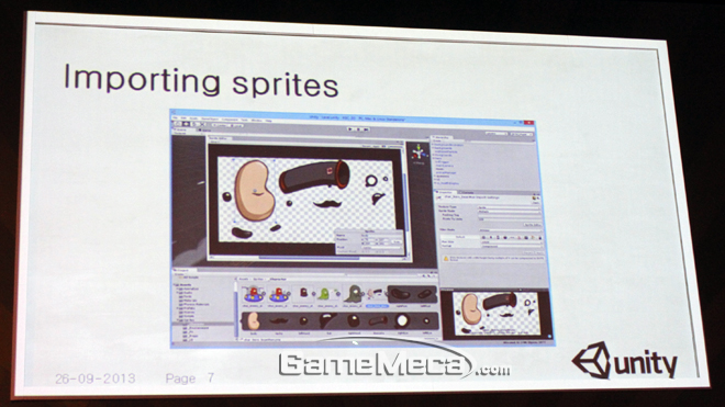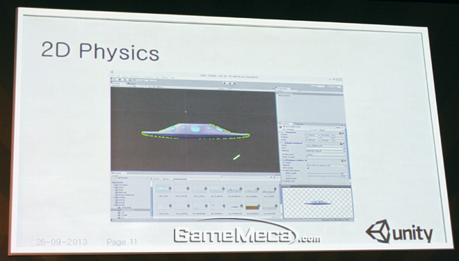 특히, 유니티는 모바일게임이 최신 트렌드로 자리잡고 2D 게임 그래픽이 각광받기 시작하자 2D 전용 빌드를 새로운 기능으로 추가했다. 직접 2D 엔진 기능을 시연한 유니티의 스틴 런드(Steen Lund) 리드 엔지니어는 “2D 엔진은 기존 3D 전용 기능과는 다르게 나뉘어진 이미지를 쉽게 프로그램에 추가할 수 있고, 애니메이션 효과도 간단하게 적용 가능하다”며 “물리 엔진도 2D 환경에 맞게 새롭게 디자인되어 더욱 쉽게 게임을 만들 수 있다”고 말했다.