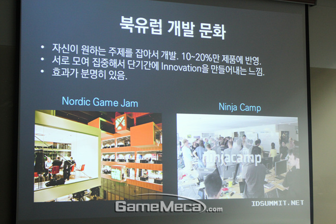 이에 앞서 이득우 전 유니티 이사는 자신이 유니티 한국지사에 몸담았을 때 느꼈던, 한국과 북유럽 간의 개발 문화의 차이에 대해 설명했다. 그는 북유럽 개발 문화를 예로 들었는데, 자신이 원하는 주제를 잡아서 개발 및 집중해 단 기간에 만들어내는 느낌이 강했다고 회고했다. 그들의 이런 방식의 효과가 분명히 있었다고 덧붙이며, 함께 모여서 같이 개발하자는 의지가 강했음을 피력했다.