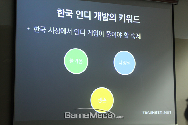 ▲ 그가 꼽은 대한민국 인디 개발의 키워드 '즐거움', '다양성' 그리고 '생존'이다