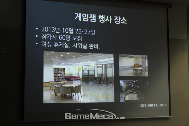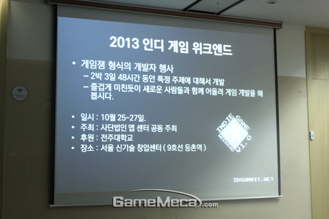 마지막으로 게임잼 형식의 개발자 행사 ‘2013 인디 게임 위크엔드’가 오는 10월 25일부터~27일까지 서울 신기술 창업센터에서 열린다는 소식을 전했다. 그는 2박 3일, 48시간 동안 특정 주제에 대해서 함께 게임 개발을 해보자는 취지로 기획된 본 행사에 많은 관심 부탁드린다고 덧붙이며 마지막 강연을 끝맺었다.