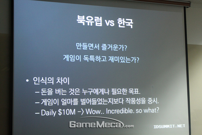 하지만 한국의 개발 문화는 작품성보다는 돈을 더 버는 것을 목표로 하는 성향이 짙다. 반면 해외 개발자들은 얼마를 벌어 들였는지 보다 작품성을 중시하는 성향이 강했다 밝혔는데, 그는 이것을 인식의 차이라고 꼬집었다. 이어 해외에서의 인디 게임 개발 문화에 대해 작년과 올해의 동향을 설명했다. 해외 스타 개발자들의 탈 회사 및 독립 프로젝트 선언이 눈에 띄게 많아졌는데, 이는 킥스타터와 같은 소셜 펀딩 사이트들의 영향력이 컸다는 것이다.