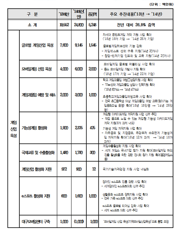 게임을 비롯한 5대 콘텐츠 육성 예산도 늘어났다. 게임산업 육성 예산은 2013년 196억원에서 2014년 248억원으로 전년 대비 26.8%, 총 52억 4800만원이 더 편성됐다. 내년도 게임산업 진흥의 핵심산업은 모바일게임 육성(20억원 증액), e스포츠 활성화(10억원 증액), 체감형 아케이드 게임 등 기능성 게임 육성(4.75억 증액), 게임과몰입 예방 및 해소산업(10억 증액), 이렇게 4가지로 압축된다.