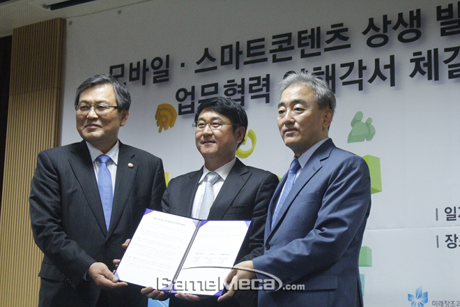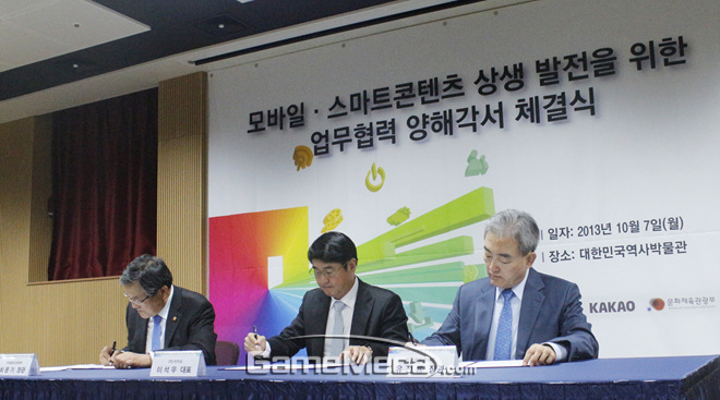 오늘(7일) 카카오는 문화체육관광부(이하 문화부)와 미래창조과학부(이하 미래부)와 함께 ‘모바일·스마트 콘텐츠 상생 발전을 위한 업무협력 양해각서 체결식’을 열었다. 이번 체결식은 문화부와 미래부가 공동으로 주관하는 콘텐츠 생태계 협의회 행사의 하나로서 모바일게임 및 일반 콘텐츠가 포함된 스마트 분야의 상생과 발전을 목표로 계획된 것이다. 이번 협력 사업에 민간 사업자로 가장 먼저 첫발을 딛게 된 카카오는 모바일 상생 생태계 조성을 위해 세 가지 협력 방안을 내놓았다.