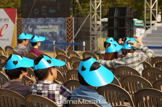 ▲ 야외에서 지켜보는 관람객의 필수품 종이 썬캡