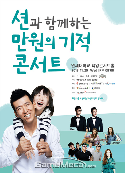 ‘만원의 기적’ 콘서트는 넥슨과 푸르매재단이 공동 주최하는 것으로, 오는 11월 20일(수) 오후 8시 연세대학교 백양콘서트홀에서 열린다. 해당 행사는 어린이 재활병원 건립 모금활동인 ‘만원의 기적’ 캠페인의 일환으로 2013년 2월 시작해 3회를 맞이했다.