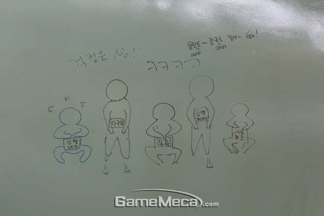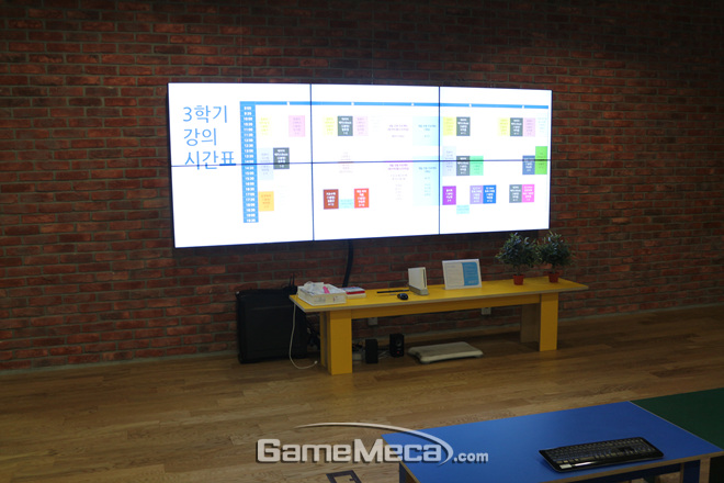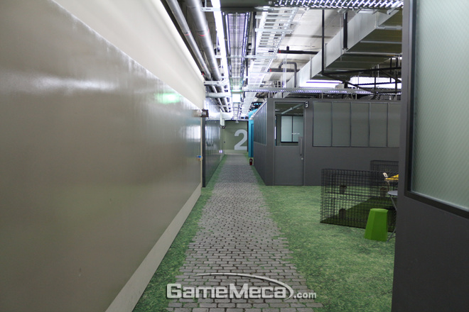다음은 교육공간으로 발을 돌렸습니다. 강의실을 이어주는 복도는 자연경관을 연상시키는 잔디나 흙, 돌의 모습으로 이뤄져 있습니다. 시각적으로 편안한 느낌을 주기도 했고, 실제로 밟아보면 푹신푹신해서 감촉도 좋습니다. 수성펜으로 벽에 낙서할 수도 있었습니다. 학생들의 장난기 넘치는 그림들을 감상할 수 있었죠.
