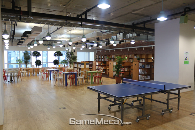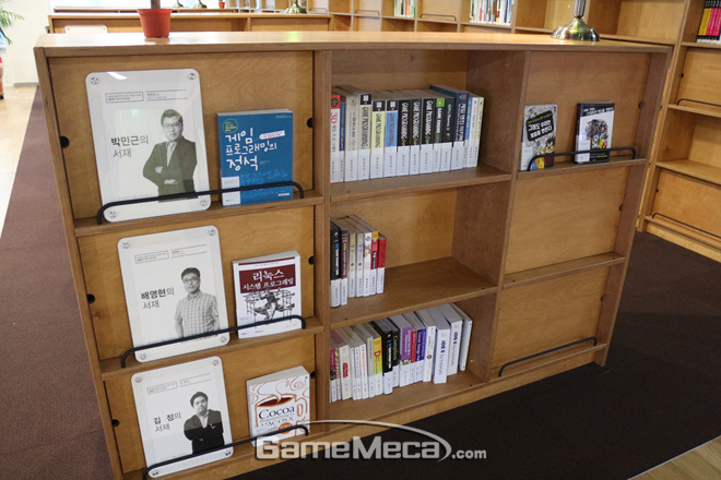 건물의 내부는 전혀 학교 같지 않은 분위기로, 편안한 느낌이었습니다. 가장 먼저 눈에 띈 것은 휴식공간으로 음료가 준비된 자판기와 서재, 콘솔 게임기 등이 있었습니다. 서재에 NHN NEXT의 교수님들이 추천하는 책들이 따로 분류돼있다는 점은 인상적이었습니다.