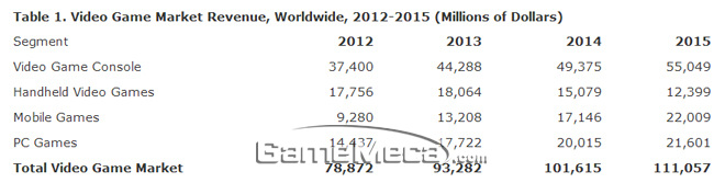 IT 분야 전문 리서치 회사 가트너(Gartner)는 29일(현지시간), 2013년 세계 게임 시장 규모가 930억 달러(한화 약 98조 6천억 원)에 달할 것이라고 예측했다. 이는 지난해 790억 달러(한화 약 83조 8천억 원)에 비해 약 17% 성장한 수치다.