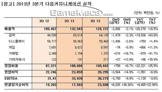 다음커뮤니케이션(이하 다음)은 오늘(8일) 2013년 3분기(7월~9월) 실적을 공시했다. 연결 기준 매출은 1,297억 원, 영업 이익은 202억 원을 달성했다.
