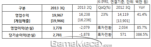 웹젠의 2013년 3분기 영업수익은 199억 원으로, 전 분기 162억 원 대비 23% 올랐다. 그리고 영업이익은 37억 원, 당기순이익 27억 원으로 각각 흑자 전환에 성공했다.