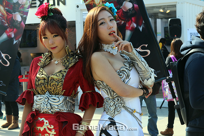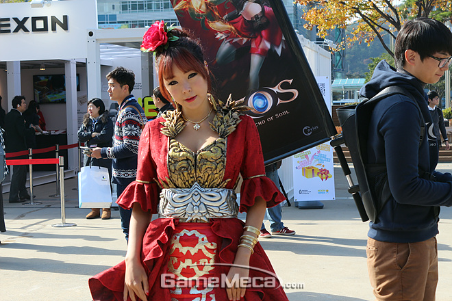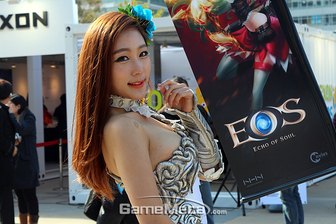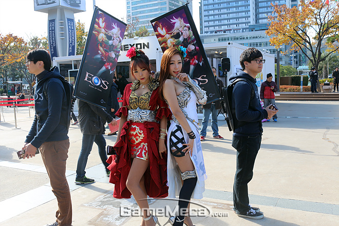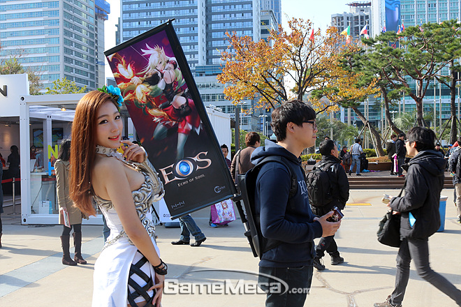 지스타가 열린 벡스코 야외광장에서 NHN엔터테인먼트의 '에오스' 모델이 포즈를 취하고 있다. NHN엔터테인먼트는 B2C 대신 '포코팡'만으로 야외무대를 조촐하게 구성했는데, 마치 '에오스도 있어요'라는 듯 부스모델과 '에오스' 깃발을 지닌 스탭이 따라다니고 있다. 원시적인 방법이지만 꽤 개성 넘치는 연출이라 관람객들의 시선을 사로 잡았다.