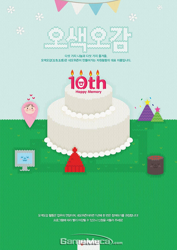 네오위즈홀딩스는 전 계열사 직원들이 참여하는 기업 자원활동 프로그램 ‘오색오감(五色五感)’이 금일(19일)부터 시작된다고 밝혔다.