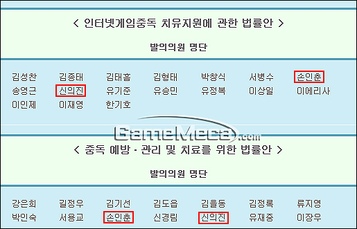 ▲ 인터넷게임중독 치유지원에 관한 법률(손인춘법) 발의의원 명단(상)과