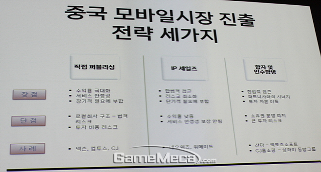 신 지사장은 마지막으로 중국 시장 진출 전략 3가지를 소개했다. 그가 설명한 진출 전략은 크게 ▶직접 퍼블리싱 ▶IP 세일즈 ▶합자/인수합병이다.
