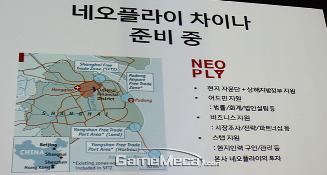 신 지사장이 이끄는 네오위즈차이나는 중국과 네오위즈 본사 간의 가교 역할을 하기 위해 노력하고 있다. 또한, 소규모 개발사 지원 프로그램 ‘네오플라이’ 의 중국 진출 버전 ‘네오플라이 차이나’ 도 준비 중이다. ‘네오플라이 차이나’ 에 선정되면 중국 현지 자문단과 상해지방정부 지원, 중국 진출의 가장 어려운 점인 법률/회계/법인설립 등 어드민, 시장조사/전략/파트너십 등 비즈니스, 현지인력 구인/관리 등 스탭 지원이 이루어진다.