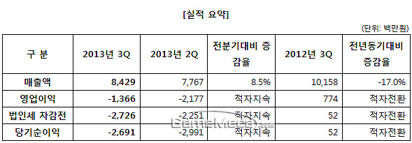 3분기 매출액은 전분기 대비 8.5% 상승했고, 영업이익과 당기순이익은 지난 분기에 이어 적자를 지속했다.