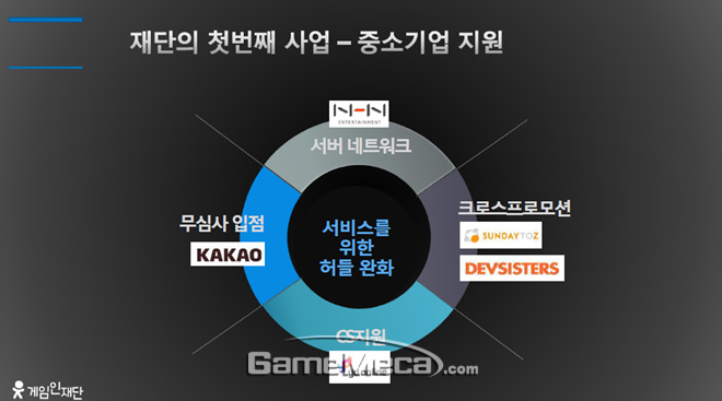 재단의 첫 사업이자 가장 주목을 받은 '힘내라 게임人상'은 게임 개발사에 주는 일종의 장학금제도다. 중소 개발사를 대상으로 매월 1개 사를 선정하여 최대 천만 원의 상금을 지원할 계획이다.